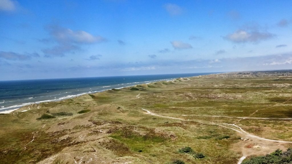 Die gute Nachricht heute Morgen beim Aufstehen: es hat abgekühlt, dank Wind und dünner Bewölkung. Die schlechte Nachricht folgt kurz nach der Abfahrt: der Wind ist stark und kommt aus der falschen Richtung (NW). Im Dünengebiet am Meer führt unsere Route anfänglich über sandige, kurvige Weglein, die ständig auf und ab gehen und Konzentration erfordern. Nach einem kurzen Stopp am Strand entscheiden wir, auf der Hauptstrasse weiterzufahren, welche nur einen schmalen, inoffiziellen “Radstreifen” verfügt und ordentlich Verkehr aufweist. Wir sind nun auf einer schmalen Landverbindung, links hinter der Düne die Nordsee, rechts der riesige Ringkolby Fjord (Grösse 300 km2, zum Vergleich Genfersee: 345 km2). In Sønder Harving versuchen wir es nochmals abseits der Hauptstrasse und enden wieder in den tückischen Dünenpfaden, in denen mit viel Gepäck und starkem Gegenwind nur ein langsames Vorankommen möglich ist. Glücklicherweise entdecken wir dann jedoch einen nagelneuen, von der Hauptstrasse abgesetzten, asphaltierten Radweg, den wir fortan benutzen. In Hvide Sande, ein Surfmekka am Zugang des Fjordes zum Meer, entdecken wir eine “Røgeri” (Fisch-Räucherei) in der wir kurz stoppen. Wir bestaunen ein nie gesehenes Angebot an Fischen und Seafood aller Art, wir kaufen einige Varianten Rauchlachs ein, ehe wir die Fahrt fortsetzen. Gut 5 Kilometer weiter machen wir Mittagsrast am Leuchtturm Lyngvig Fyr und besteigen diesen via 228 Stufen. Ab Søndervig führt die Westküsteroute dann wieder etwas zurückversetzt auf Nebenstrassen und Feldwegen, nicht superdirekt dafür quasi ohne Verkehr nordwärts. Die letzten 7 Kilometer bis zum Tagesziel Thorsminde sind dann nochmals “Fleissarbeit” auf pfeilgerader Strecke gegen den Wind.