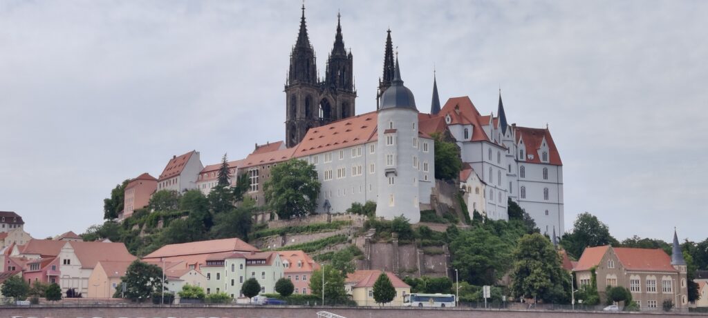 Da ich ja in einem Hotel ohne Verpflegung übernachtet habe, gibt es Frühstück in einem Café in der Altstadt von Torgau. In Torgau spielten sich ja zum Ende des 2. Weltkrieges im Jahr 1945 historisch bedeutende Szenen ab, als die von Osten vorrückenden russischen Truppen auf die von Westen Deutschland befreienden Amerikaner/Alliierte aufeinander getroffen sind. Ich besichtige das bereits im 1945 von den Sowjets installierte Denkmal am Fusse der Burg Hartenfels. Die Fahrt beginnt westseitig der Elbe, auf der Höhe von Mühlberg entscheide ich, über die dortige moderne Elbebrücke auf die Ostseite zu traversieren. Obwohl die Westseite an sich wohl interessanter wäre, die Städte Riesa und Strehla lasse ich rechts von mir liegen. Aber man kann schlichtweg nicht alles anschauen, auch wenn man 3 Wochen Zeit hat. Auf der Ostseite kann man bei 3 Elbebögen „abkürzen“ und spart sich somit sicher 15 Kilometer. Ab Merschwitz, rund 15 Kilometer vor dem Tageshöhepunkt Meissen, wird auch die Landschaft wieder interessanter: Plötzlich gibt es links und rechts von der Elbe steile Erhebungen, teils sogar Felswände. Schloss Hirschstein am Westufer thront von weither sichtbar und kündigt definitiv eine andere Gegend an. Nochmals deutlich imposanter ist dann die Albrechtsburg von Meissen, die als Steinbau seit 1471 besteht. Damit gilt es als ältestes Schloss Deutschlands. Nach einem längeren Verpflegungs- und Fotohalt in der Altstadt von Meissen (auf der Westseite der Elbe) rolle ich weiter nach Dresden bzw. den Vorort Cotta, welcher auf einem Hügelzug oberhalb der Stadt liegt. Noch bevor ich die Trams von Dresden erblicke bzw. bevor ich durch die Gottfried-Keller-Strasse fahre, erinnert mich Dresden irgendwie an Zürich.