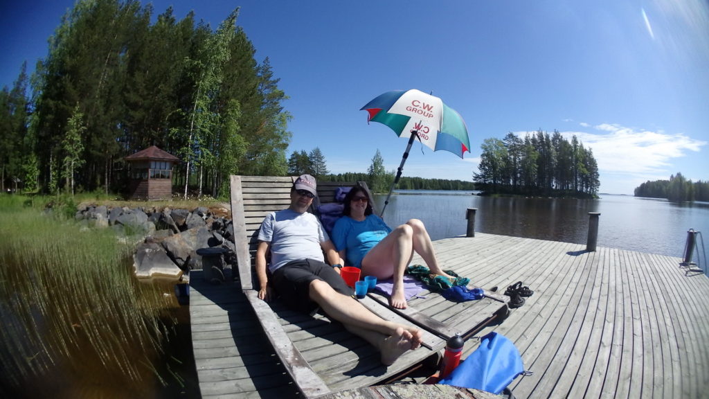 Bereits in der Nacht klart es auf, wir können den Vollmond beobachten und der erste Tag im Mökki präsentiert sich von seiner besten Seite. Nach dem eher kühlen Vortag hat die Temperatur bereits wieder sommerliche Werte angenommen. So geniessen wir das finnländische «Nichtstun» in unserem Mökki am Höytiäinen in der Bucht bei Kihnamo: Sonnenbaden auf dem Deck (der See hat nur 15 Grad), Vögel beobachten (Singschwäne, Prachttaucher, Seeschwalben, Wacholderdrosseln und einige andere), Essen, Schlafen, Lesen, mit dem Ruderboot um das vorgelagerte Inselchen rudern, Grillieren und am Abend die Sauna einheizen und mit einem Saunagang den Tag beschliessen.