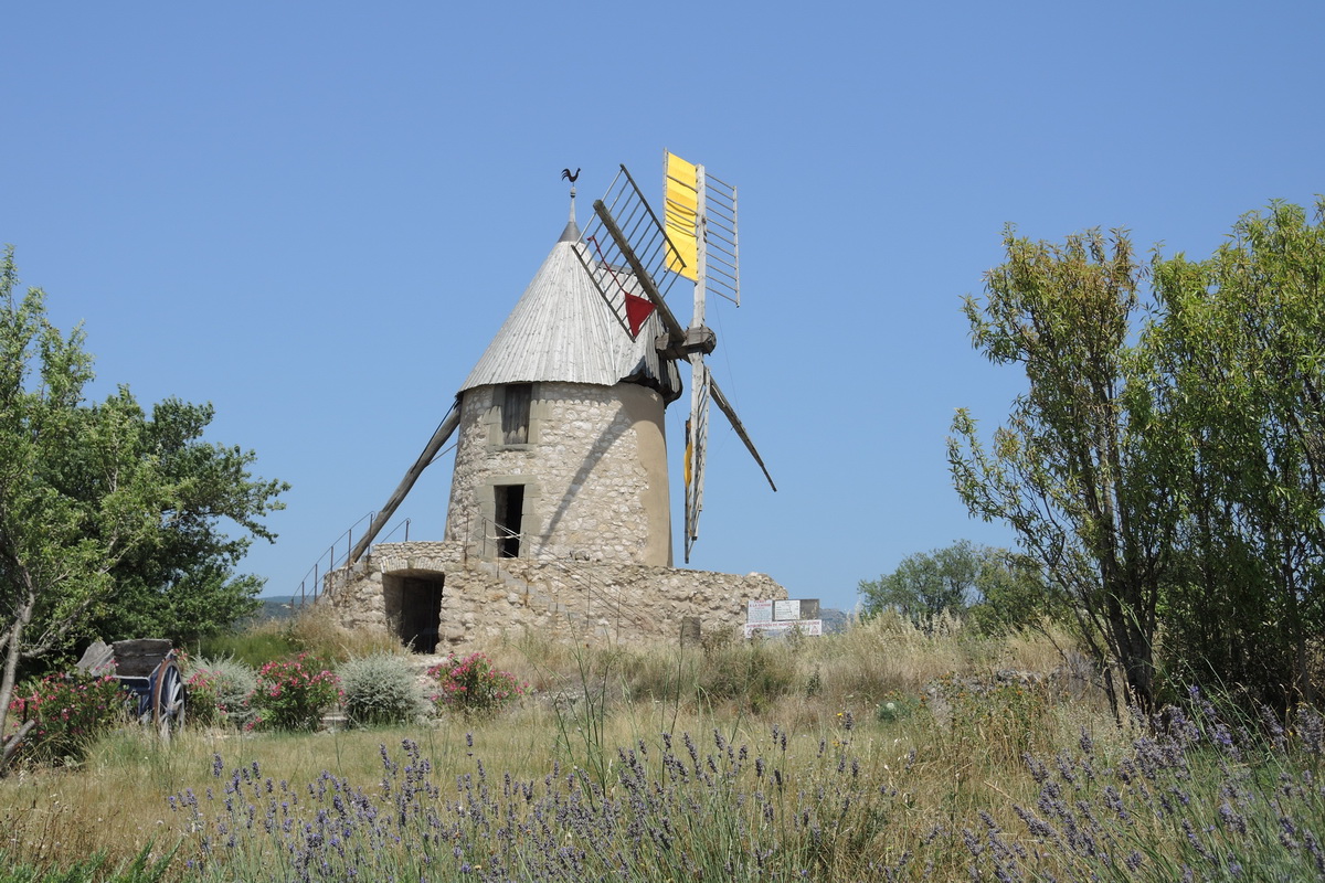 Trotz der Hitze und des starken Windes machen wir eine Erkundungstour per Velo. Der Waldbrand in der Umgebung konnte über Nacht gelöscht werden. In Villeneuve besuchen wir eine restaurierte Windmühle, von denen es einige hat in dieser Gegend. Die Mühle wurde Originalzustand restauriert und produziert Mehl wie anno dazumal, zu Demozwecken.