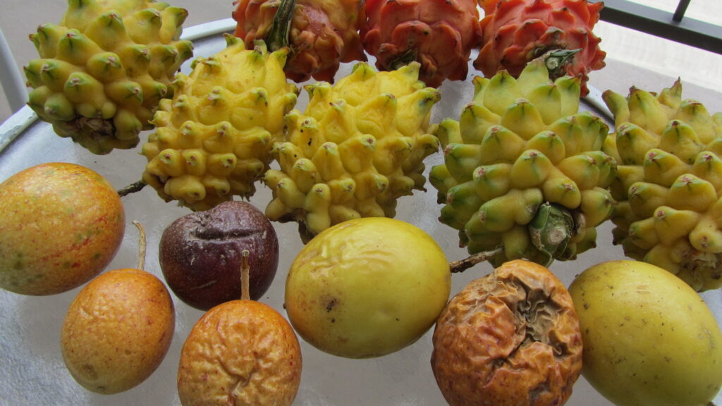 Nach einem späten Frühstück war als erstes der Besuch des Wochenmarkets in Keauhou angesagt. Farmer Brad (den ich im Flug LA-Kona kennengelernt hatte) hatte mir dies empfohlen, da er dort selber zwei Stände hat. Und tatsächlich, Brad ist dort an seinem gut frequentierten Stand, und verkauft diverse tropische Früchte die er auf seiner Farm produziert. Brad empfängt mich herzlich und lässt mich von seinen Früchten kosten. Wow, die gelbe Dragonfruit (eine Kaktusfrucht) ist unglaublich lecker! Voll ausgereift und direkt ab Farm, sowas ist undenkbar in der Schweiz. Auch die orange Dragonfruit (mit rotem Fleisch) schmeckt sehr fein. Und die säuerlich aromatische Passionsfrucht, genial. Ich kaufe für 20 Dollar Früchte ein bei Brad (siehe Foto). Brad lädt mich zu einem Besuch auf seine Farm ein, werde versuchen diese Gelegenheit wahrzunehmen. Anschliessend Shopping in Kona, was angesichts des eher trüben Wetters (trotzdem haben wir 28 Grad) ideal passt. Am Abend feines Sushi Dinner bei Kenichi Pacific.