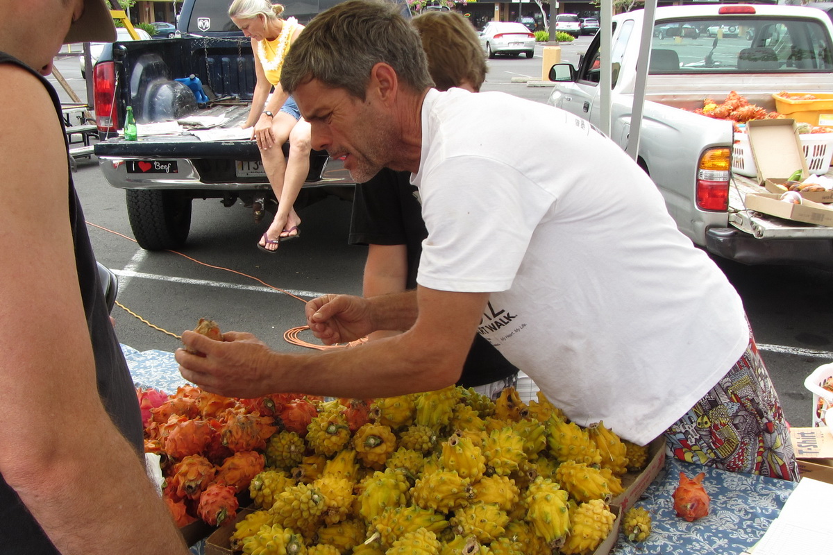 Nach einem späten Frühstück war als erstes der Besuch des Wochenmarkets in Keauhou angesagt. Farmer Brad (den ich im Flug LA-Kona kennengelernt hatte) hatte mir dies empfohlen, da er dort selber zwei Stände hat. Und tatsächlich, Brad ist dort an seinem gut frequentierten Stand, und verkauft diverse tropische Früchte die er auf seiner Farm produziert. Brad empfängt mich herzlich und lässt mich von seinen Früchten kosten. Wow, die gelbe Dragonfruit (eine Kaktusfrucht) ist unglaublich lecker! Voll ausgereift und direkt ab Farm, sowas ist undenkbar in der Schweiz. Auch die orange Dragonfruit (mit rotem Fleisch) schmeckt sehr fein. Und die säuerlich aromatische Passionsfrucht, genial. Ich kaufe für 20 Dollar Früchte ein bei Brad (siehe Foto). Brad lädt mich zu einem Besuch auf seine Farm ein, werde versuchen diese Gelegenheit wahrzunehmen. Anschliessend Shopping in Kona, was angesichts des eher trüben Wetters (trotzdem haben wir 28 Grad) ideal passt. Am Abend feines Sushi Dinner bei Kenichi Pacific.