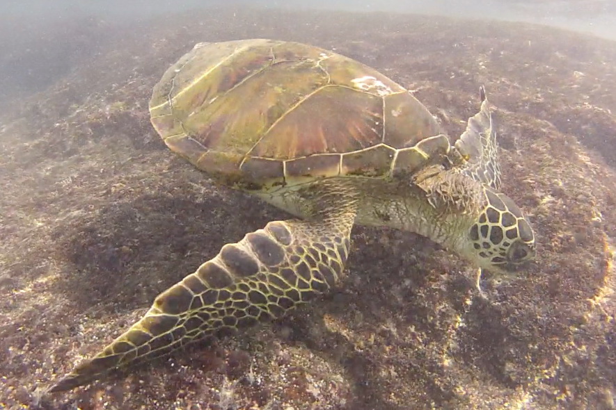 Heute nehmen bereits die ersten Eitzinger Gäste Abschied. Ich habe noch 3 volle Tage auf Big Island vor mir. Mein Tagesziel heute ist, die bereits mehrmals gesichteten Wasserschildkröten mal etwas genauer zu beobachten. Am späteren Vormittag gehe ich in die nahegelegene Keauhou Beach mit meiner Unterwasserkamera und der Schnorchel Ausrüstung. Beim ersten Schnorchel-Gang werde ich noch nicht fündig, doch nach dem Mittag sind sie da, die Turtles. Sie hängen meist den Felsen entlang im seichten Wasser, und fressen dabei Seegras oder ähnliches, was sich auf den Steinen bildet. Mindestens 5 Wasserschildkröten in unterschiedlichen Grössen (von ca 30 cm bis ca 80 cm) konnte ich heute beim Schnorcheln entdecken.