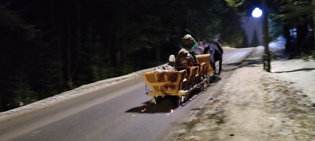 Den ursprünglich noch vorgehsehenen Besuch der Therme Zakopane lasse ich bleiben. Dafür besuche ich das nahegelegene Koscielisko, wo es u.a. eine weitere Langlaufloipe bzw. Biathlon-Anlage gibt. Es gibt jedoch keine Schneekanonen hier, doch aufgrund der Schneefälle der letzten Tage ist die Loipe nun auch präpariert. Zudem hat es viele Kutscher (Kulig) hier, auch solche mit Schlittenkufen, welche funkensprühend über den halb schneebedeckten Asphalt zischen.