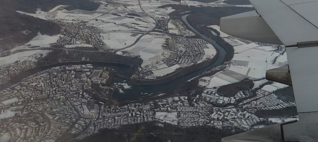 Der Rest der Heimreise klappt dann reibungslos, im Landeanflug nach Zürich erspähe ich unter mir den Rheinfall und Schaffhausen (siehe Foto). Und bereits um 19:00 Uhr besteige ich den Bus in Einsiedeln in Richtung Alpthal.